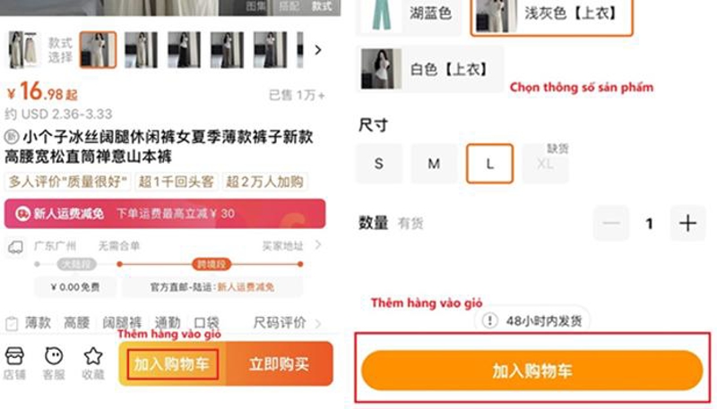 Chọn thông số sản phẩm sau đó nhấn “加入购物车” để thêm hàng vào giỏ