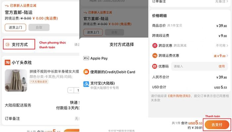 Sau khi tạo đơn, bạn nhấn vào “支付方式” (Cách thức thanh toán) để chọn phương thức phù hợp. Taobao hỗ trợ thanh toán bằng thẻ Credit/Debit Card hoặc Alipay, giúp giao dịch nhanh chóng và an toàn.