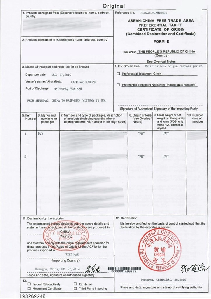 C/O Form E được cấp theo Hiệp định Khung về Hợp tác Kinh tế Toàn diện giữa Hiệp hội các Quốc gia Đông Nam Á (ASEAN) và Cộng hòa Nhân dân Trung Hoa (ACFTA).