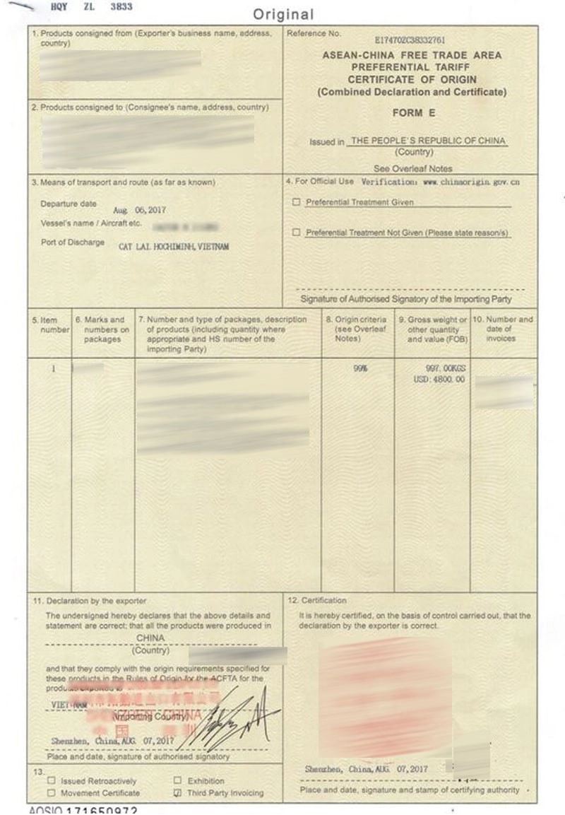 Ngày nay các công ty Việt Nam giao dịch mua bán với đối tác Trung quốc thường gặp phải giấy chứng nhận xuất xứ ưu đãi thuế quan (C/O form E) hóa đơn bên thứ 3 với nội dung: